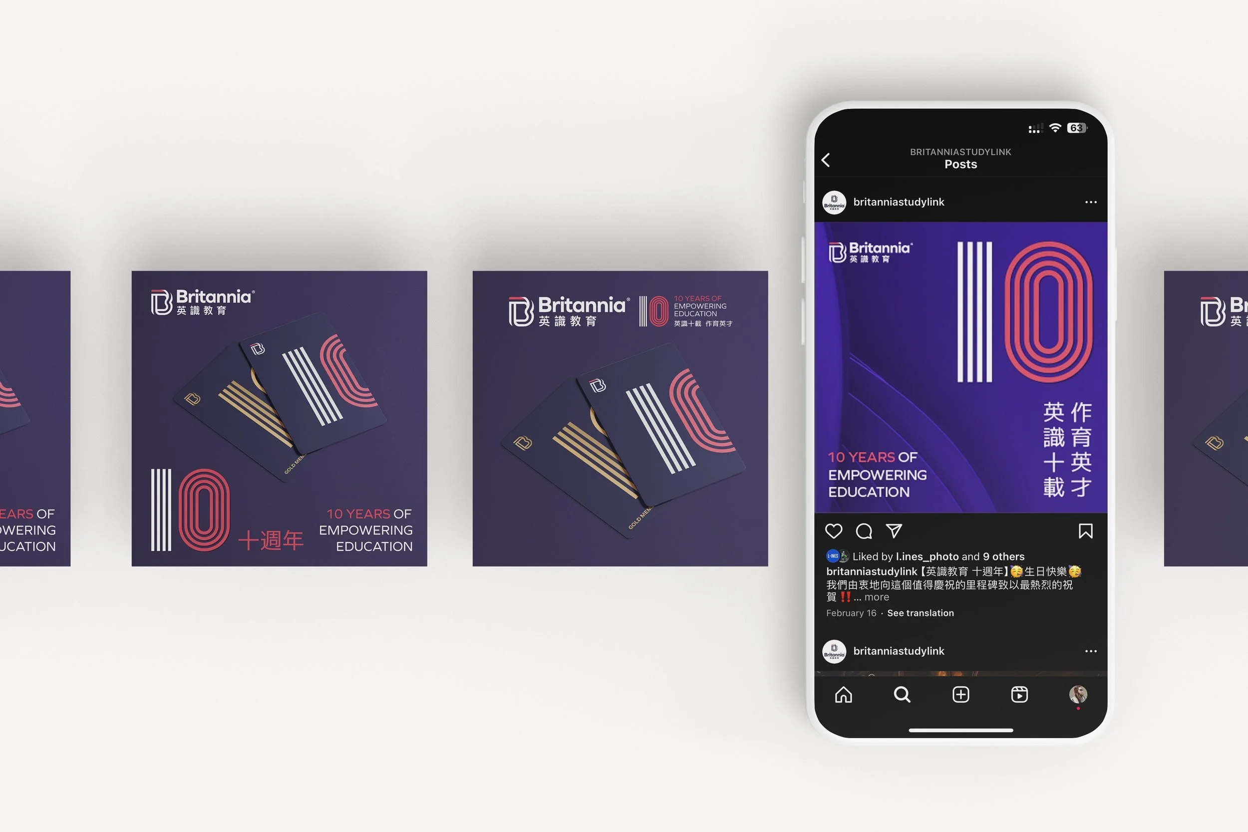 As the Brand Design Consultant for Britannia StudyLink Hong Kong’s 10-Year Anniversary Campaign, I developed a refined, cohesive visual identity to celebrate a decade of empowering students. The campaign’s running track motif symbolizes Britannia’s commitment to guiding students toward academic success as a leading UK boarding school and university placement agency.